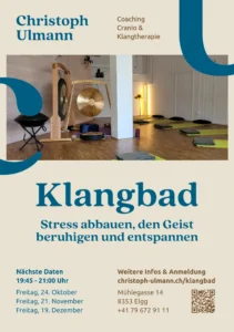 Diese Klangbäder erlebe ich als unglaublich entspannend, Körper und Geist beruhigend, wohltuend und einfach extrem schön. Christoph ist wunderbar einfühlsam und stimmt das Klangbad auf die Gruppe ab. Der grosse Gong fährt in den Körper ein. Die Schwingungen sind spürbar. Vielen Dank!!!
